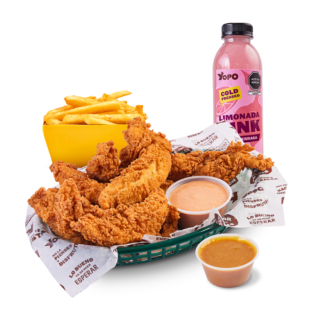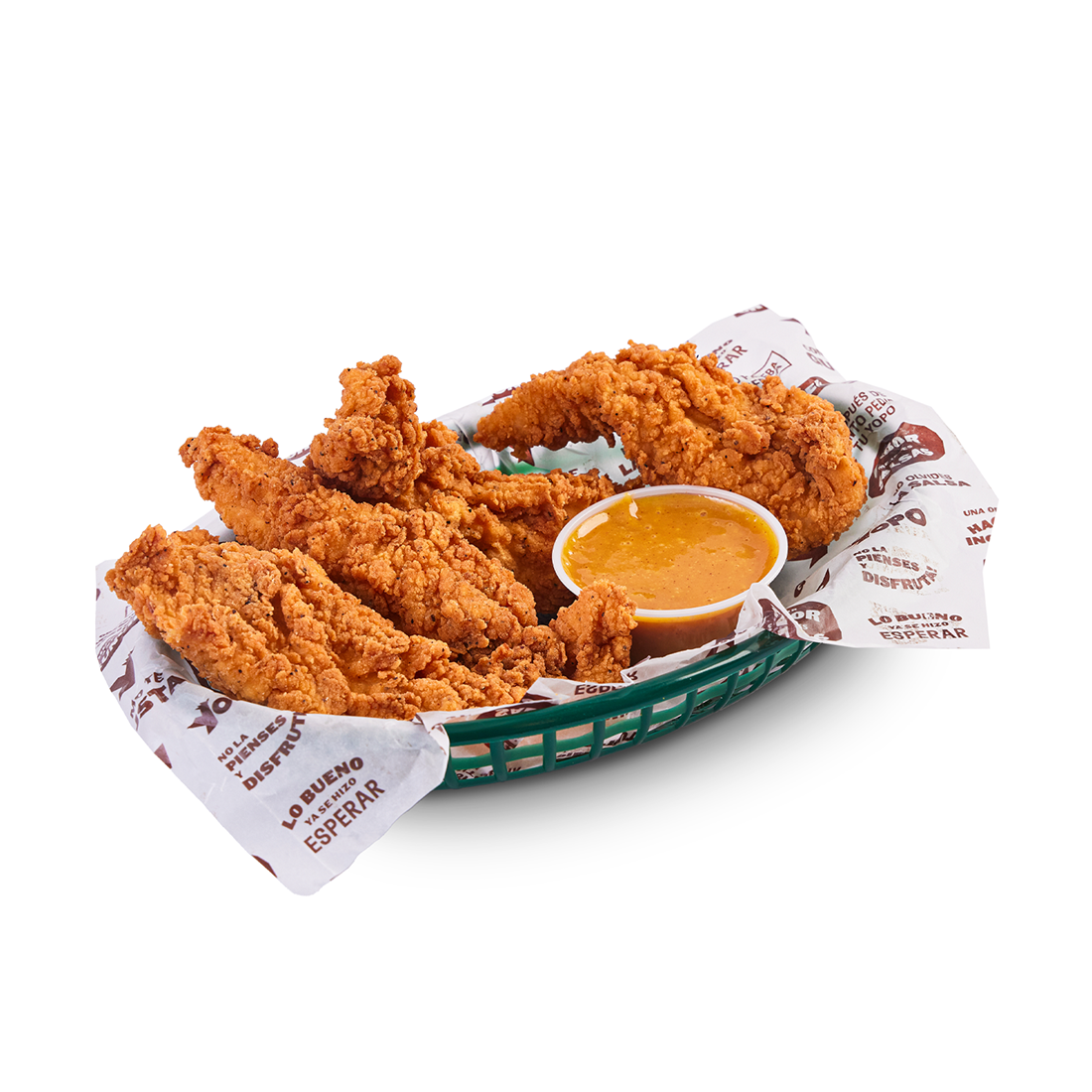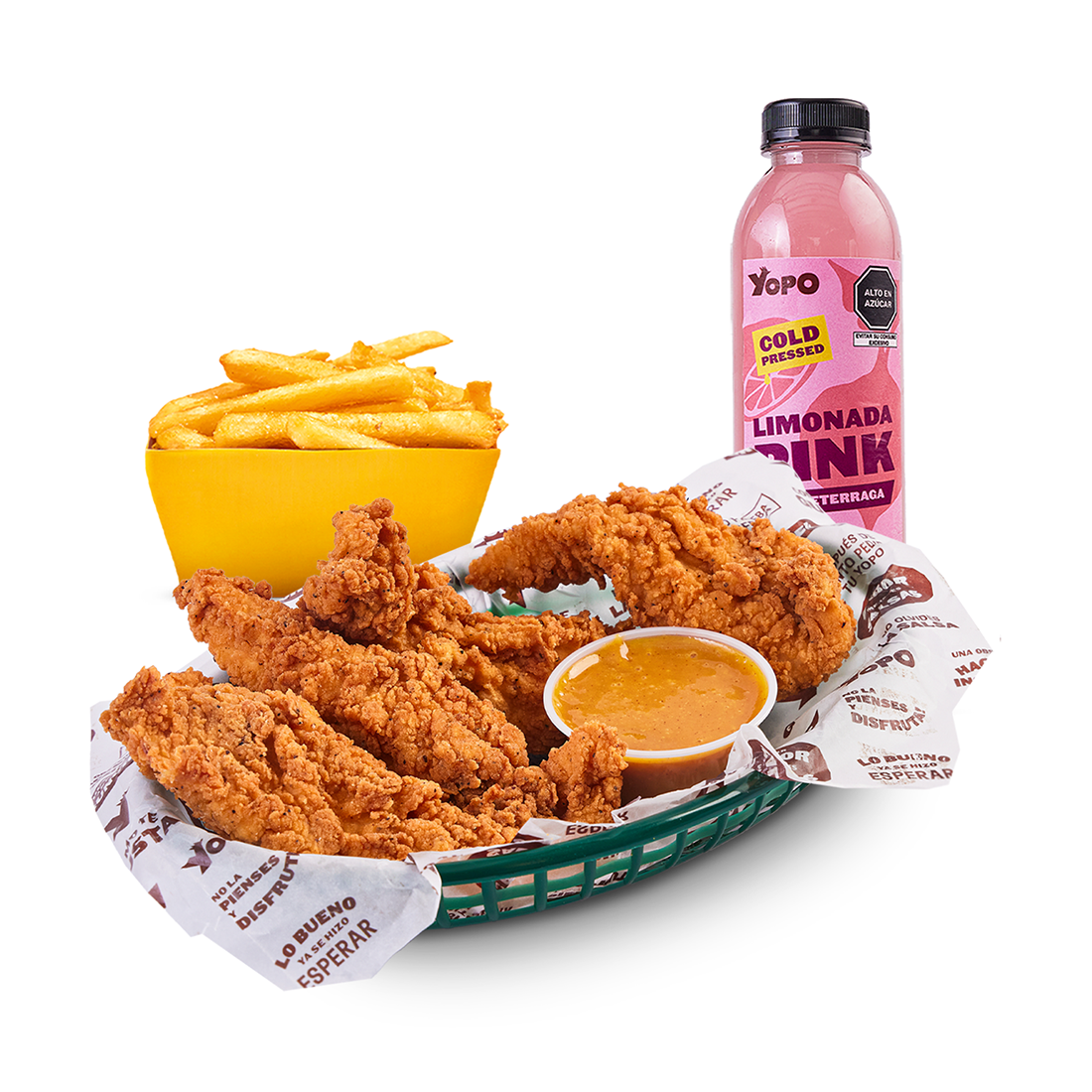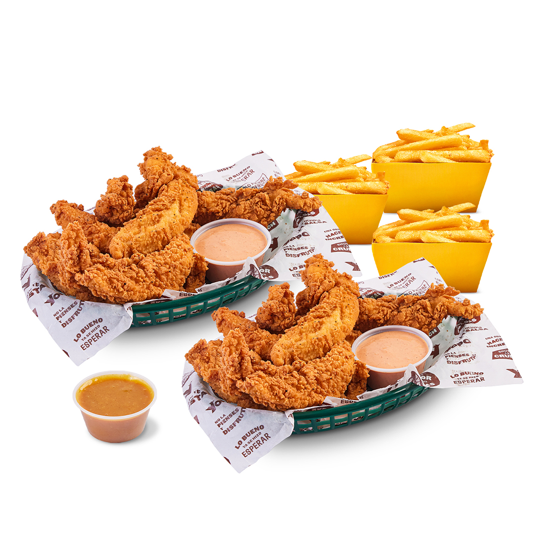 3 tenders, lechuga, pico de gallo, tocino, choclo americano, guacamole y nachos.